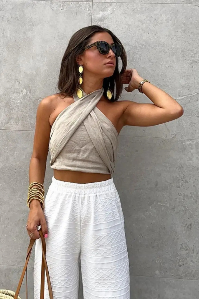 Sleeveless Halter Linen Blend Top with Wrap and Open Back