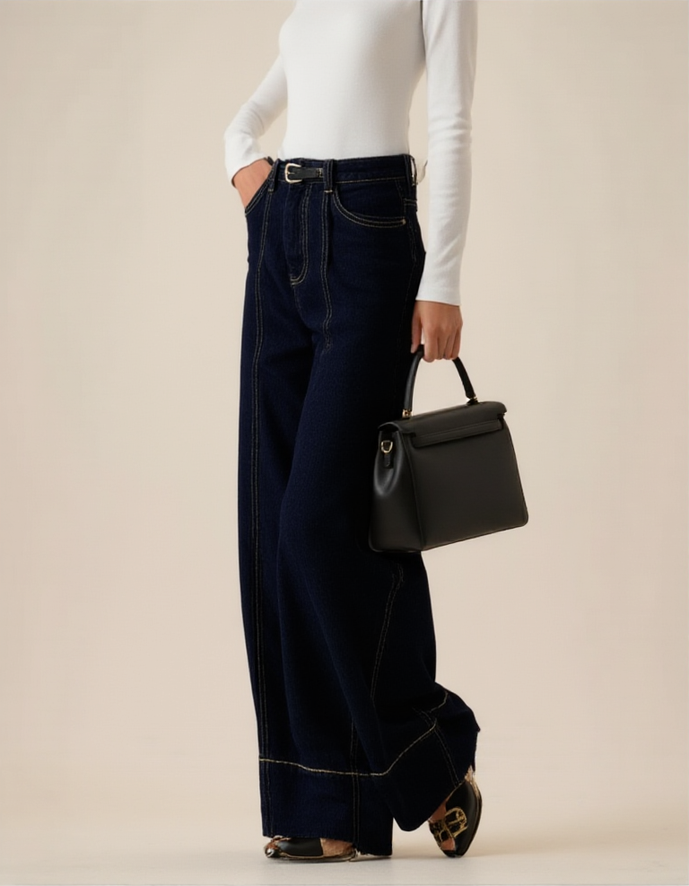 Wide Leg High Waist Denim Jeans with Contrast Stitch Loose Fit