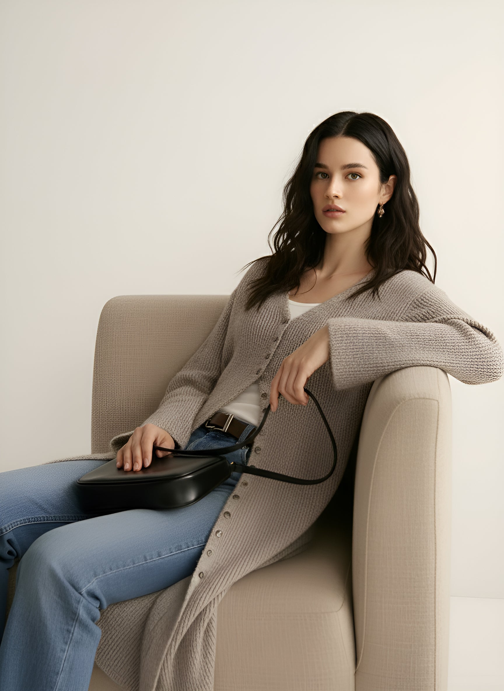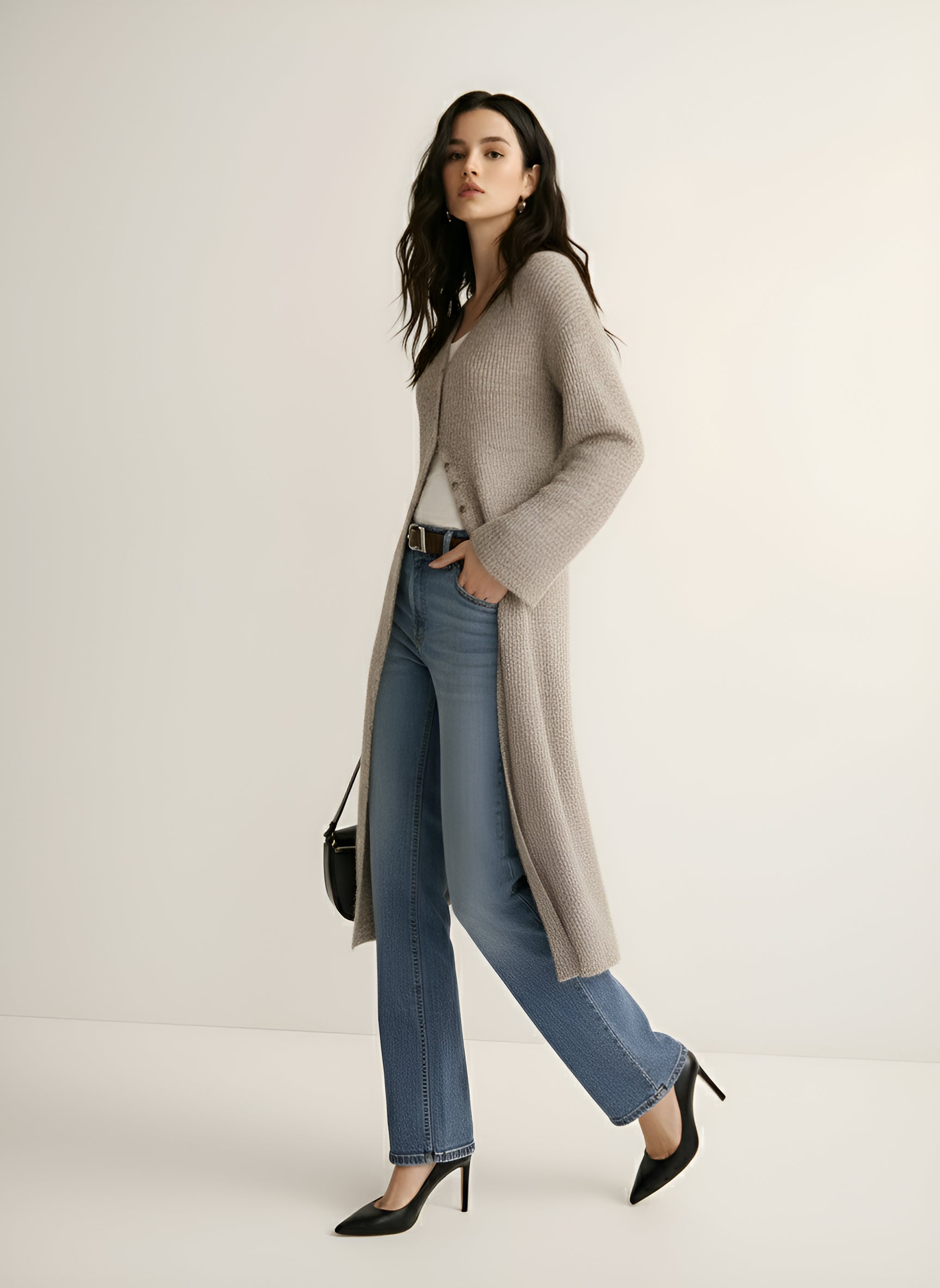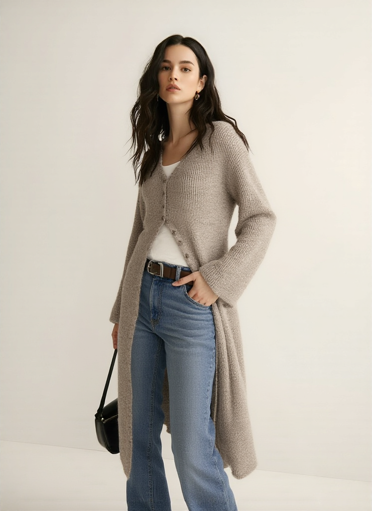 A long knitted cardigan with a V-neckline and button closure. The relaxed fit makes it easy to style for both casual and refined looks.