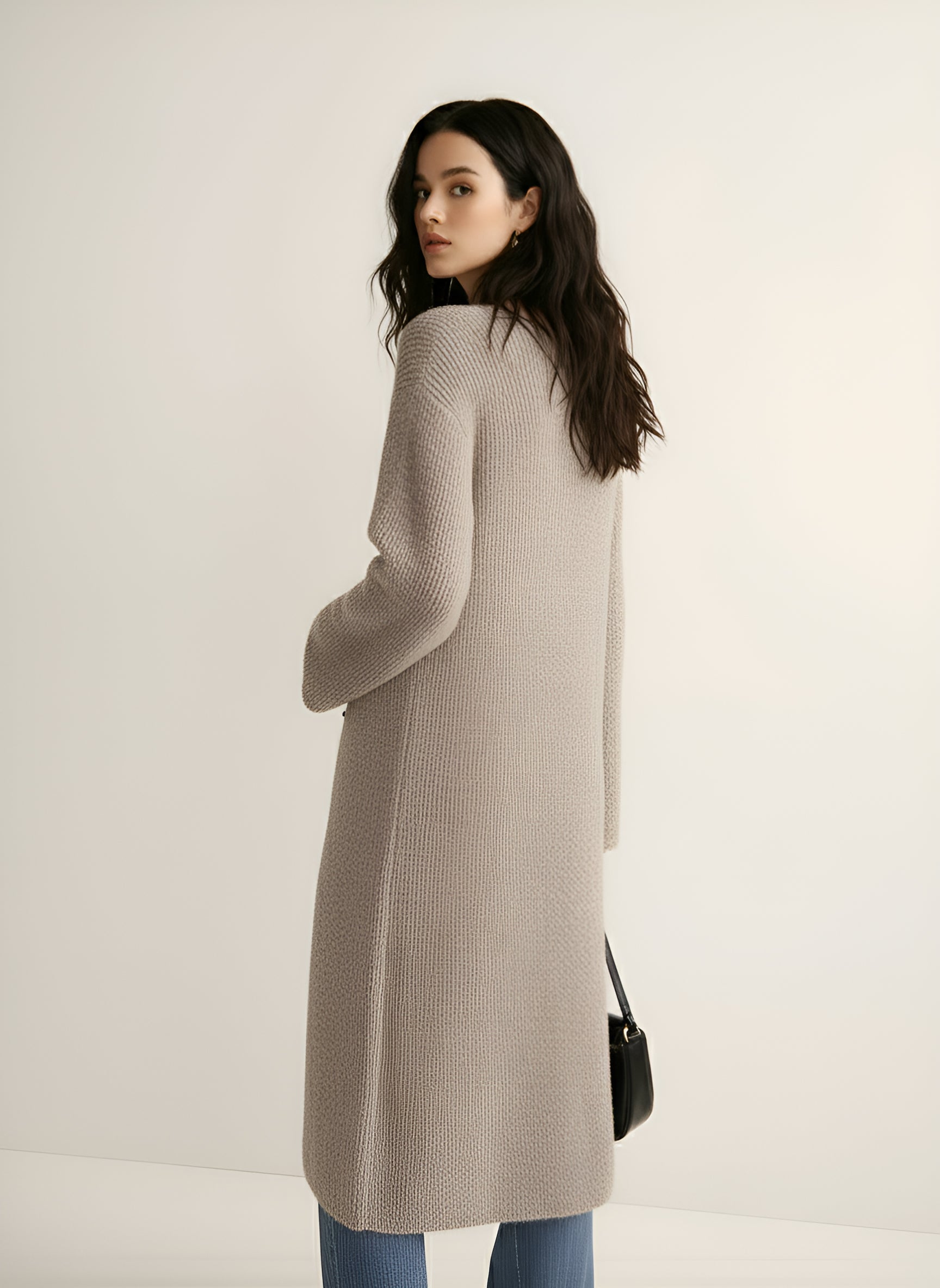 Long Knitted Cardigan with V-Neckline Buttons and Relaxed Fit