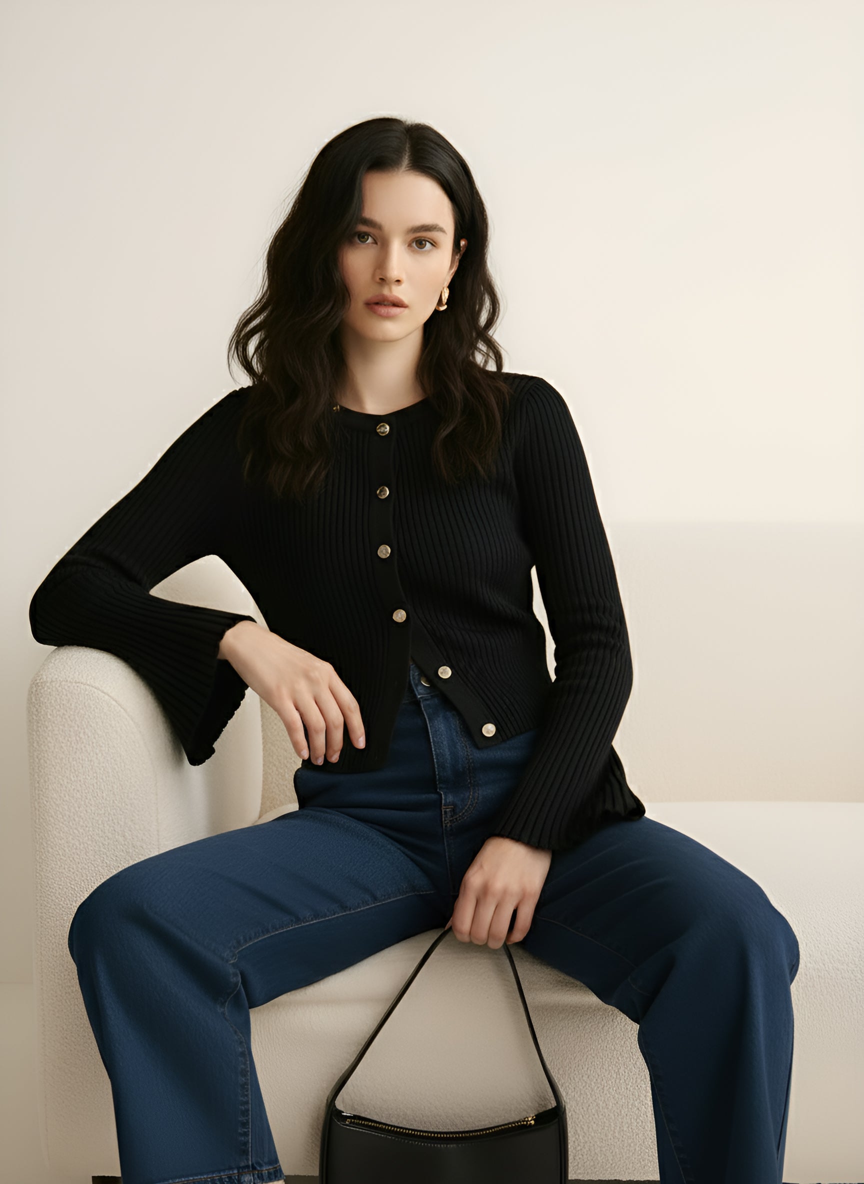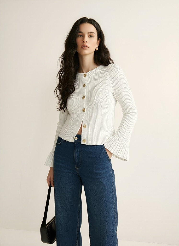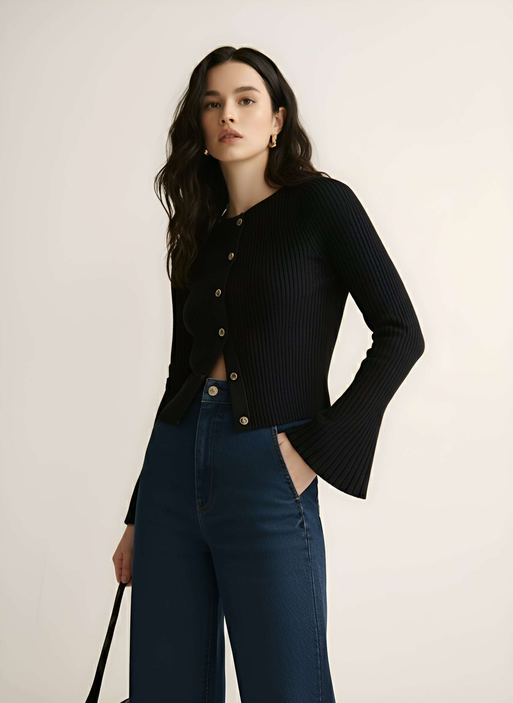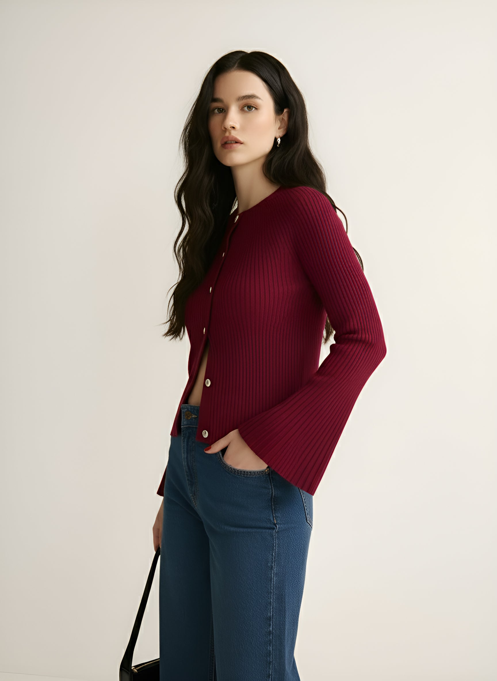 A ribbed cardigan with a round neckline and front button closure. The slim fit and flared sleeves create a flattering silhouette for both casual and dressy looks.