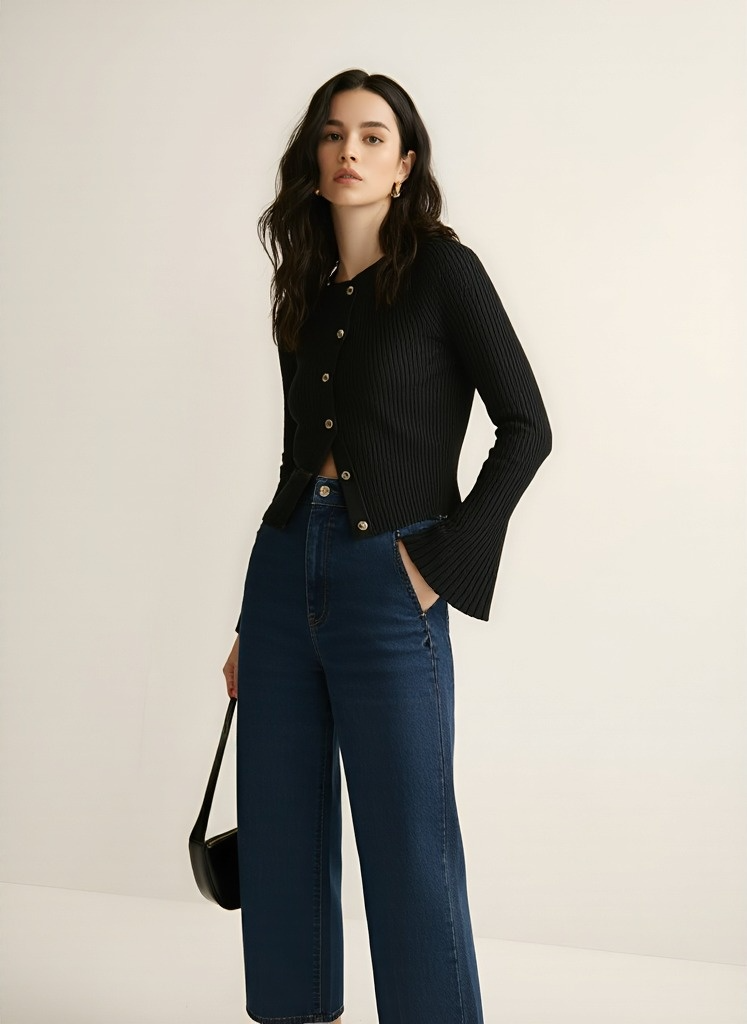 Ribbed Knit Cardigan with Round Neck Buttons and Flared Sleeves