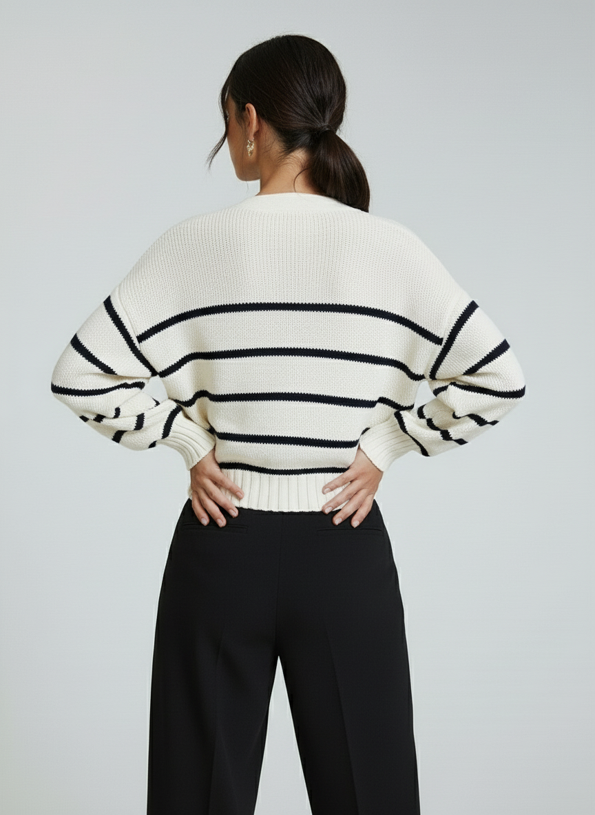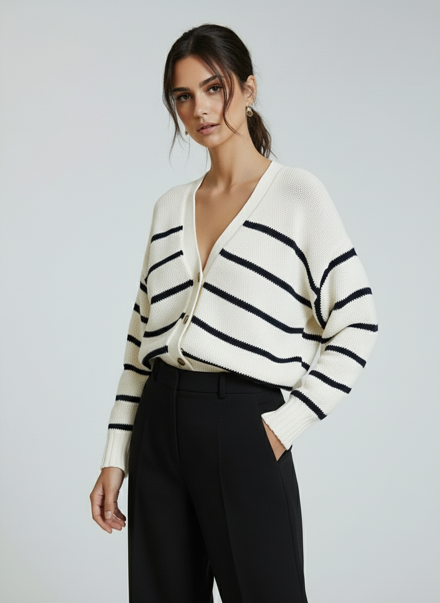 A cotton cardigan with navy stripes and a relaxed fit. Easy to wear as a light layer on cooler days.