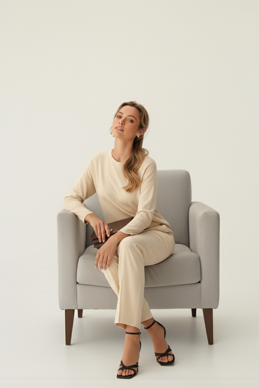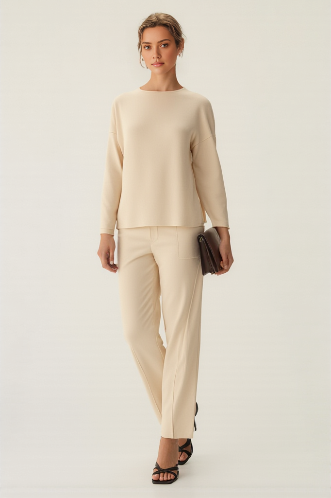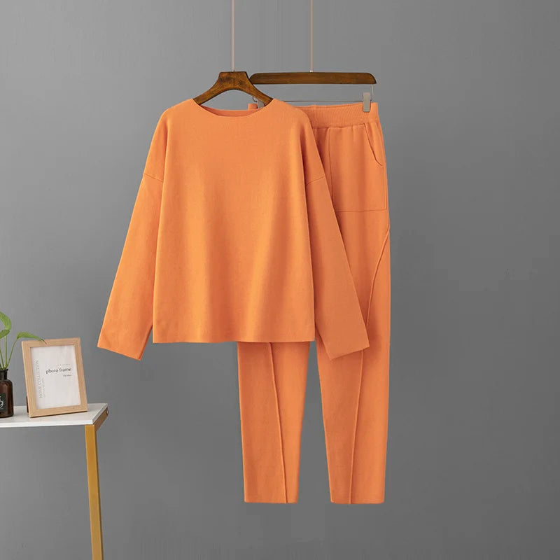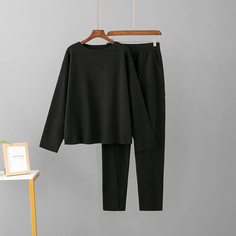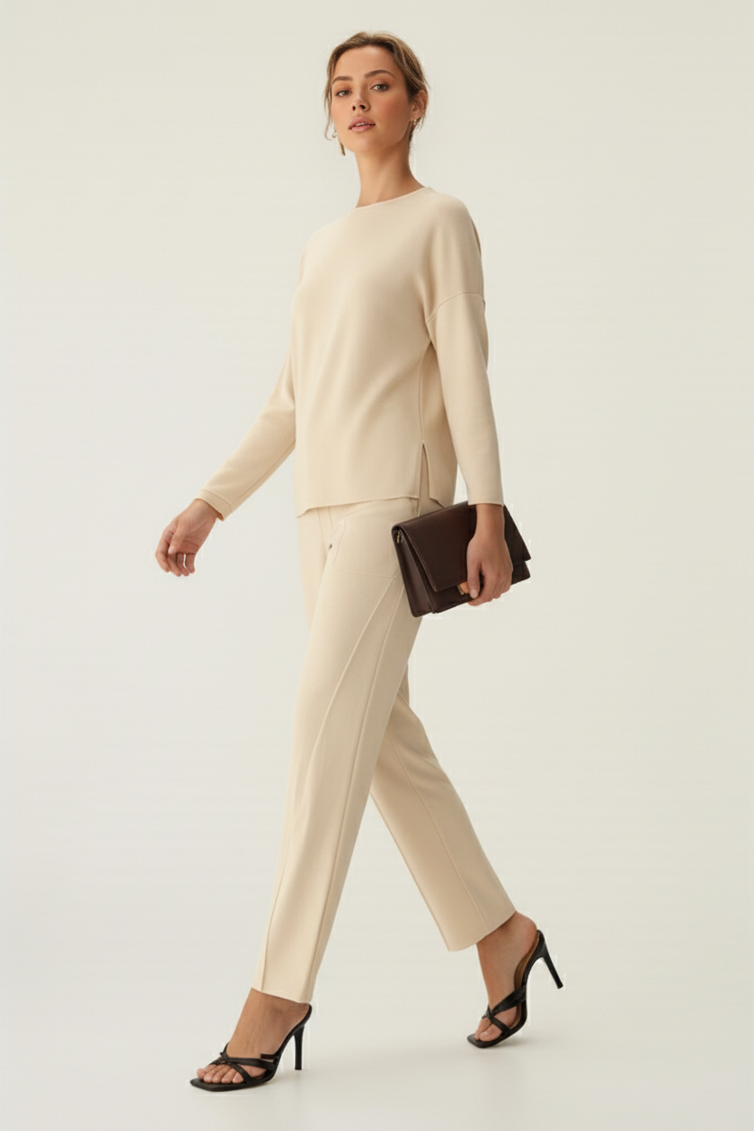 A minimalist lounge set with relaxed knitted sweater and tapered pants. Made from soft viscose blend for warmth and comfort.