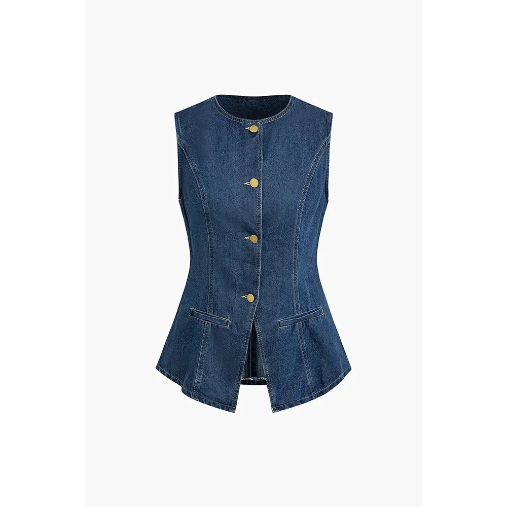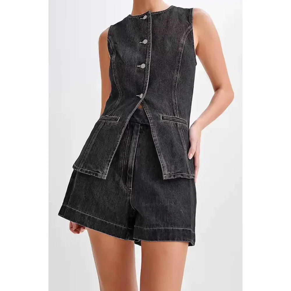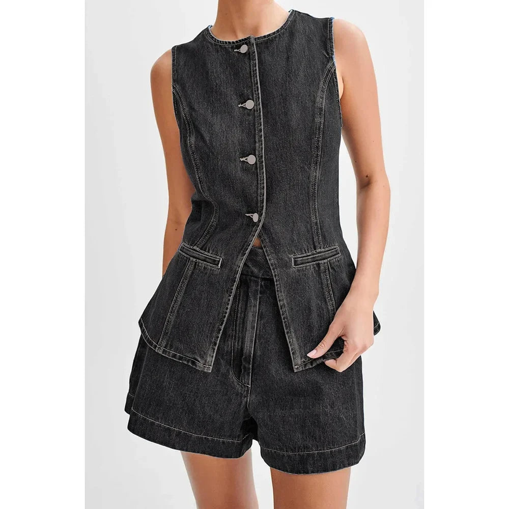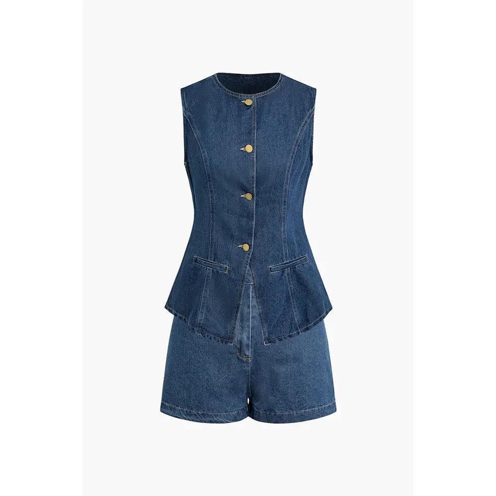 A two-piece denim set with a sleeveless top and matching shorts. Designed with a button-front top and slim fit silhouette.