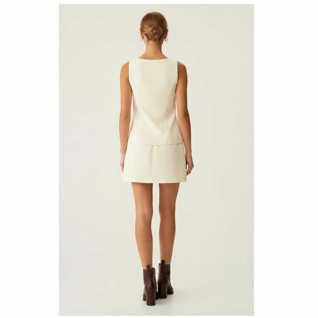 A tailored two-piece set with a sleeveless blazer top and high-waisted mini skirt.