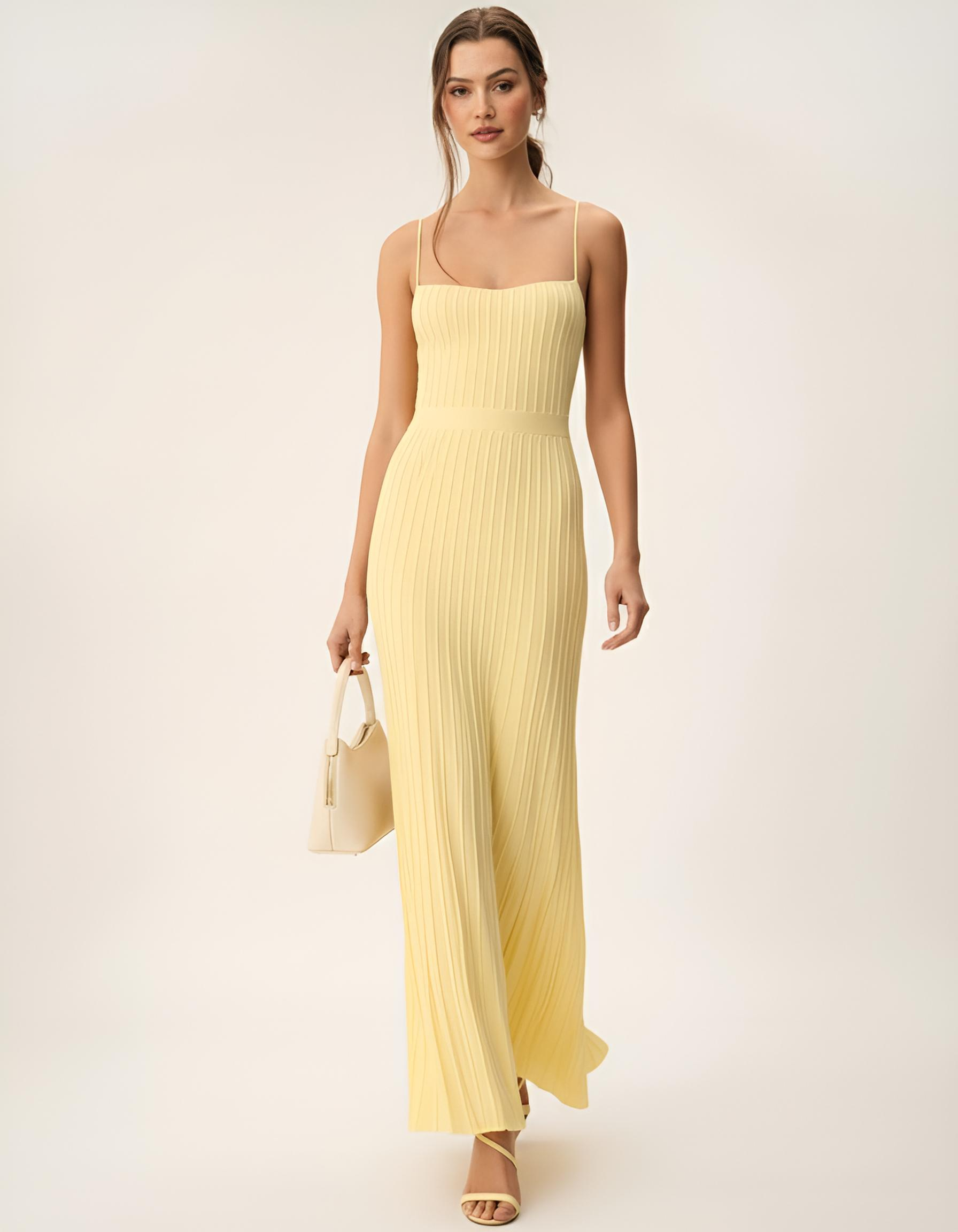 Knitted Midi Dress with Thin Straps Pleated Texture and Square Neckline