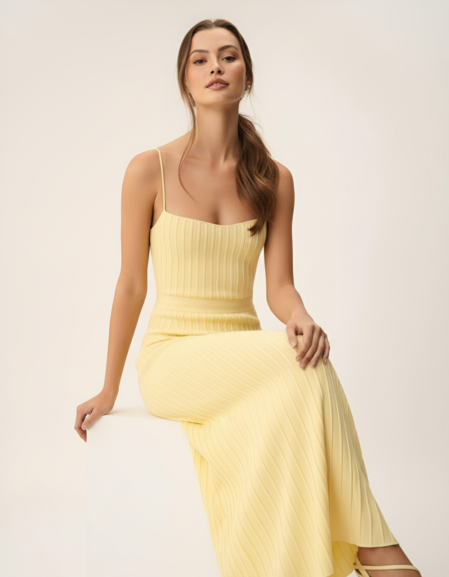 A knitted midi dress with thin straps and a square neckline. The pleated design and flared hem create a soft, elegant look.