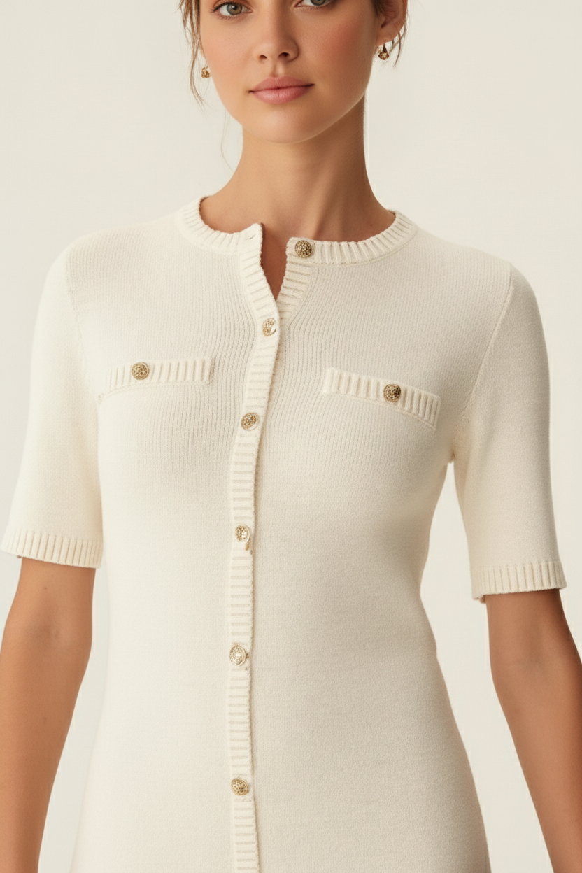 Knitted Mini Dress with Short Sleeves Front Buttons and Decorative Pockets