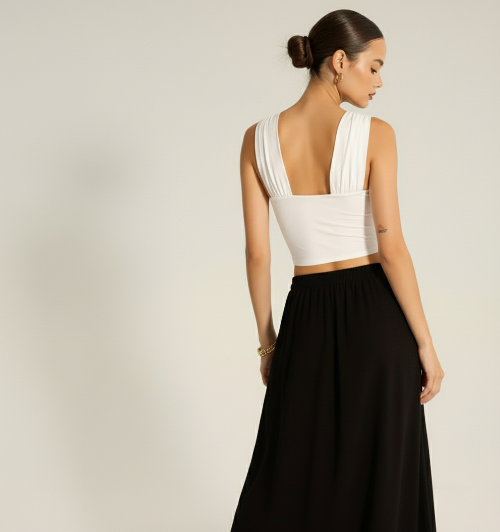 A one-shoulder top with a knot detail on the strap and an asymmetrical neckline. Made from a soft, stretchy fabric with a slim fit.