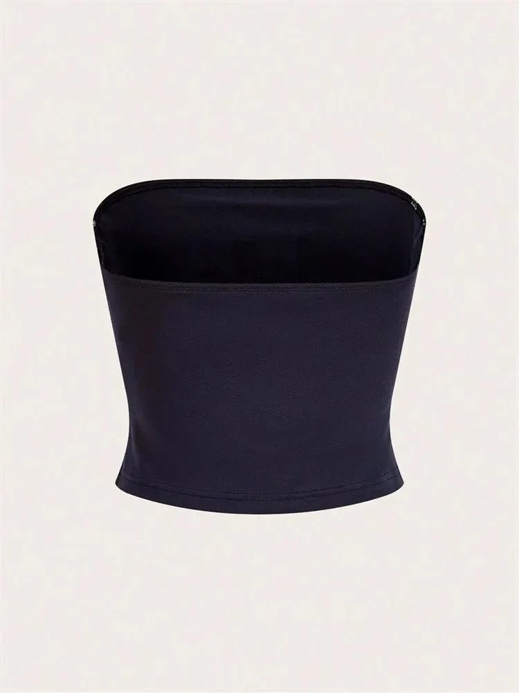 A cropped tube top with star and letter print in a bold streetstyle look.