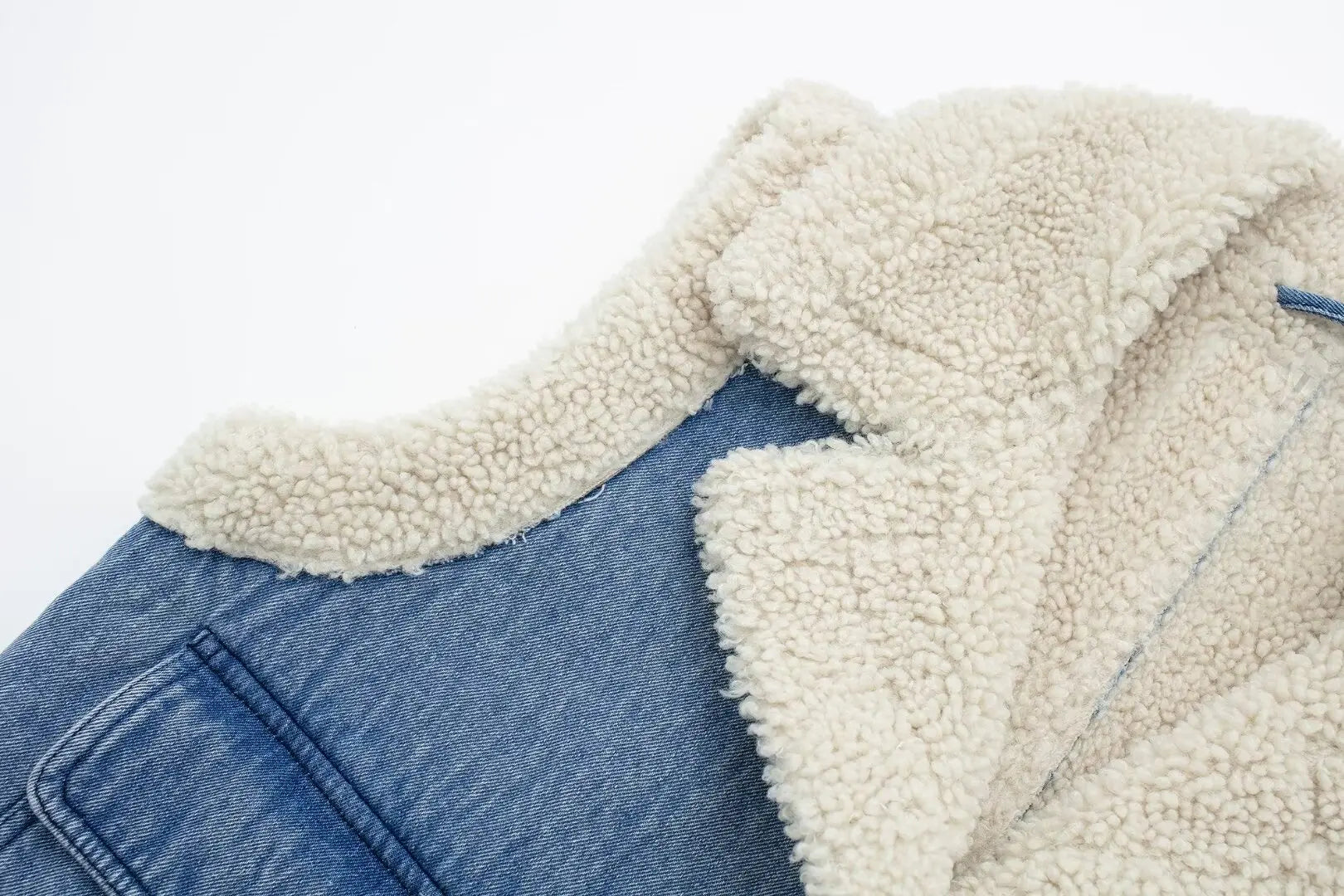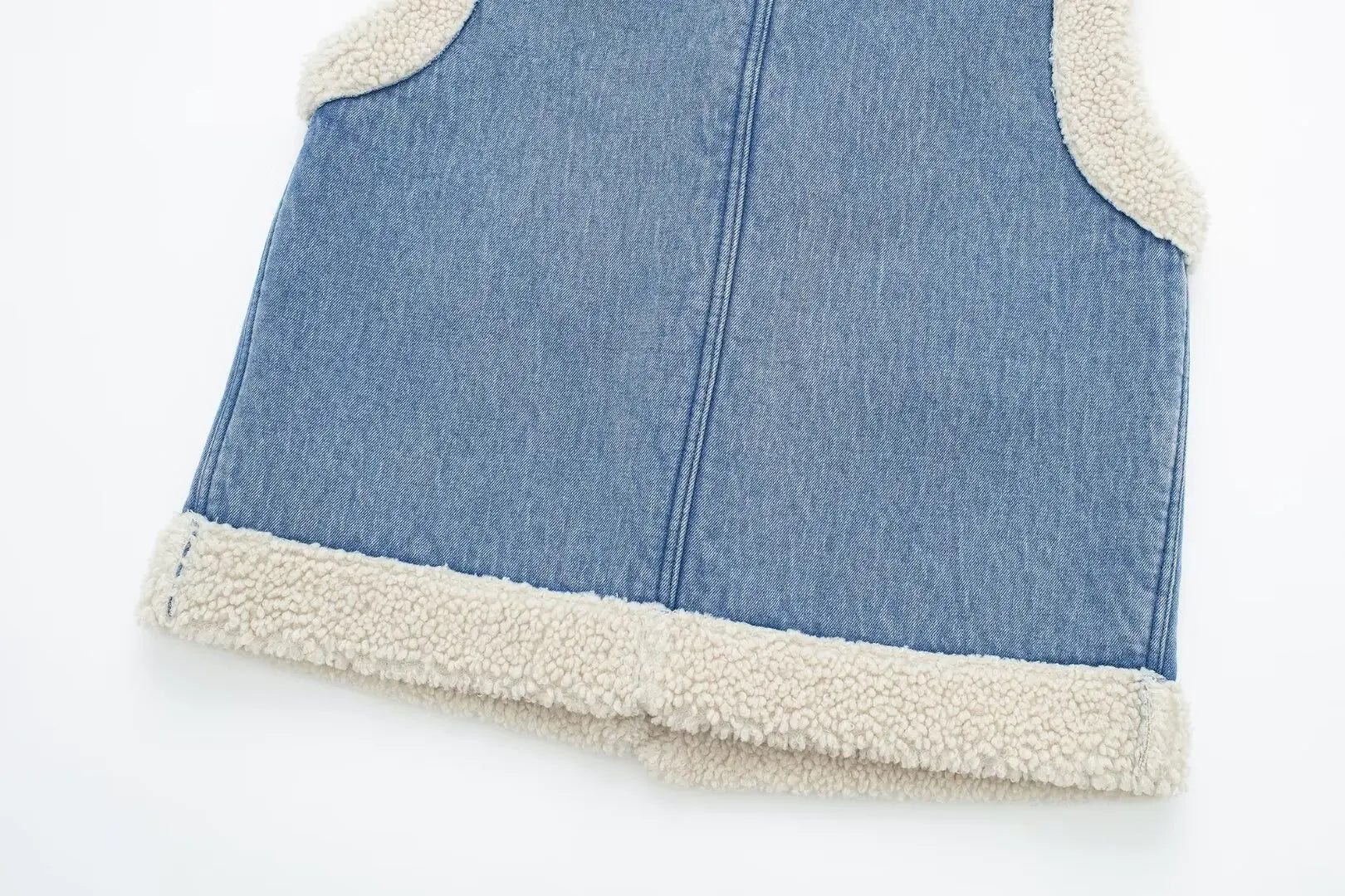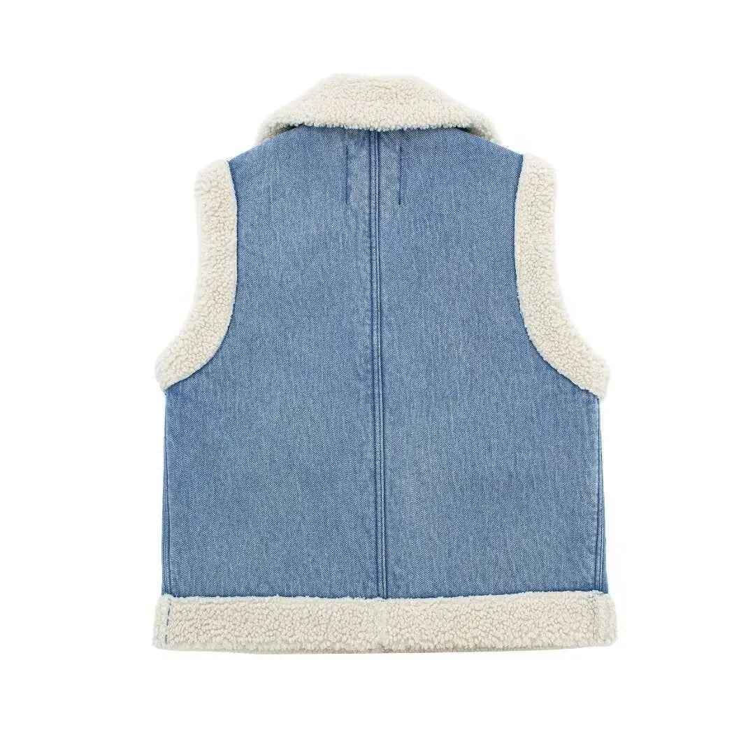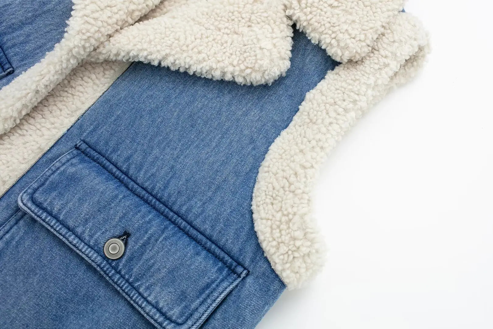 Denim Vest with Fleece Lining Collar and Buttons Casual Fit