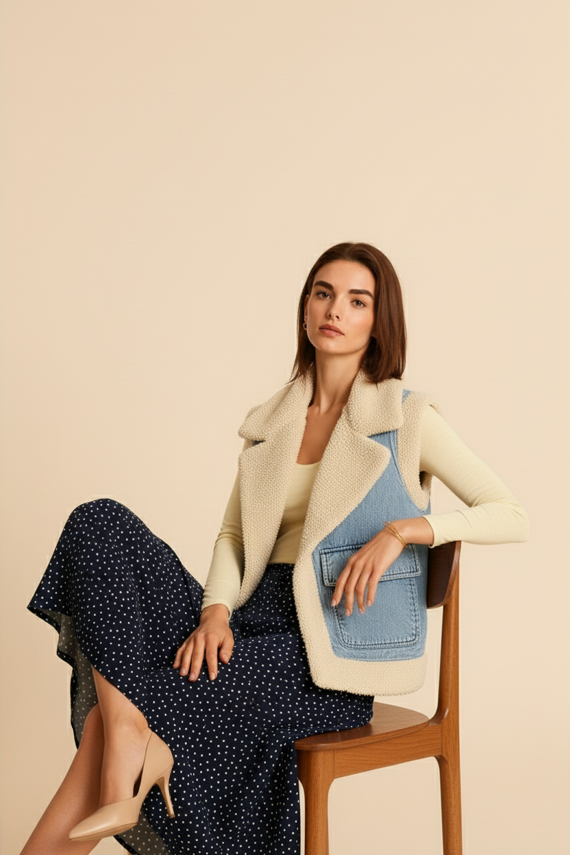 A denim vest with fleece lining and classic collar. Designed with front button closure, two pockets, and regular fit.