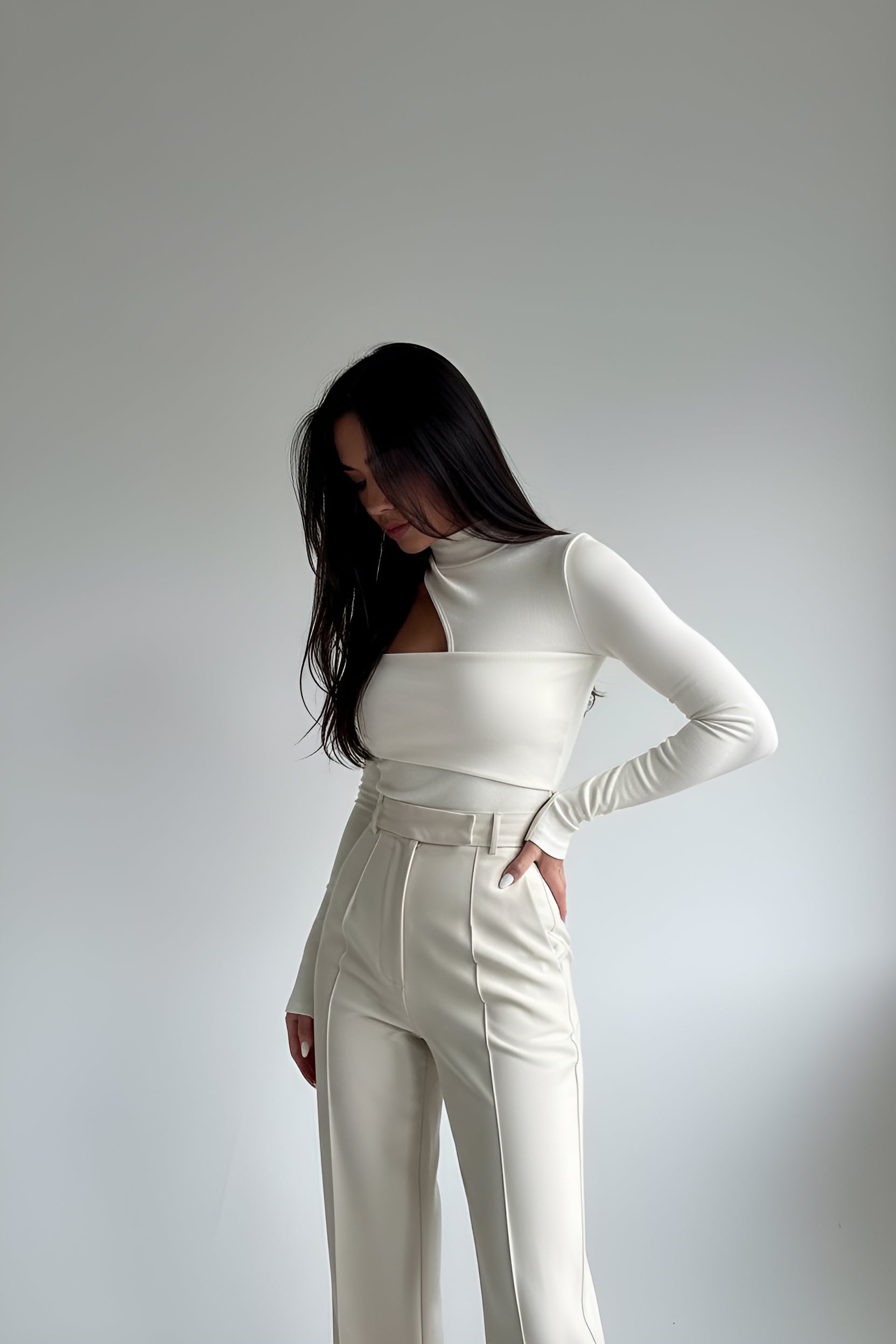 A ribbed top with an asymmetrical cutout and polo neckline. Designed with long sleeves and a slim, flattering fit.