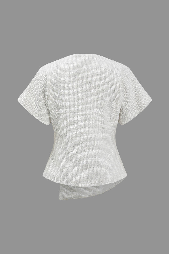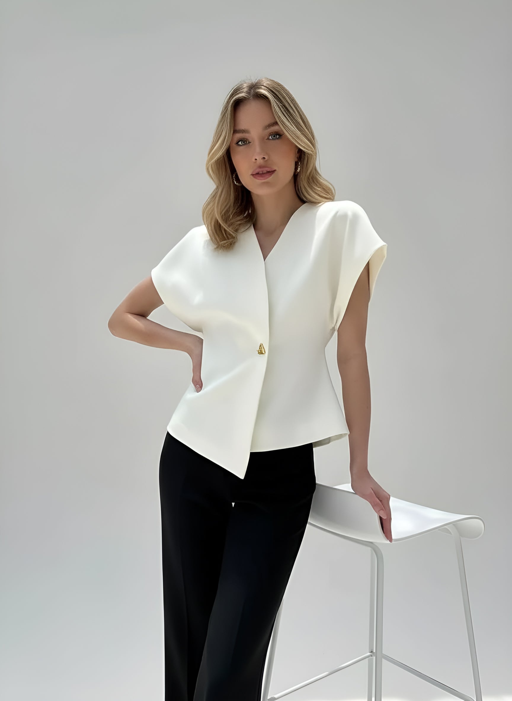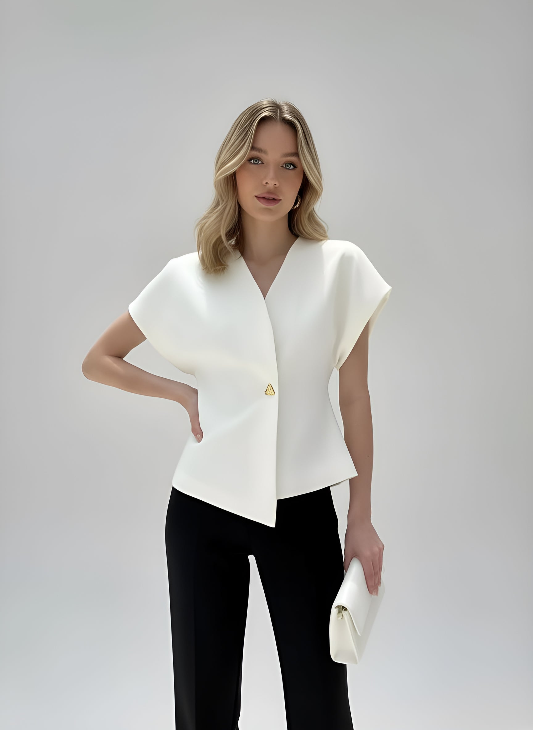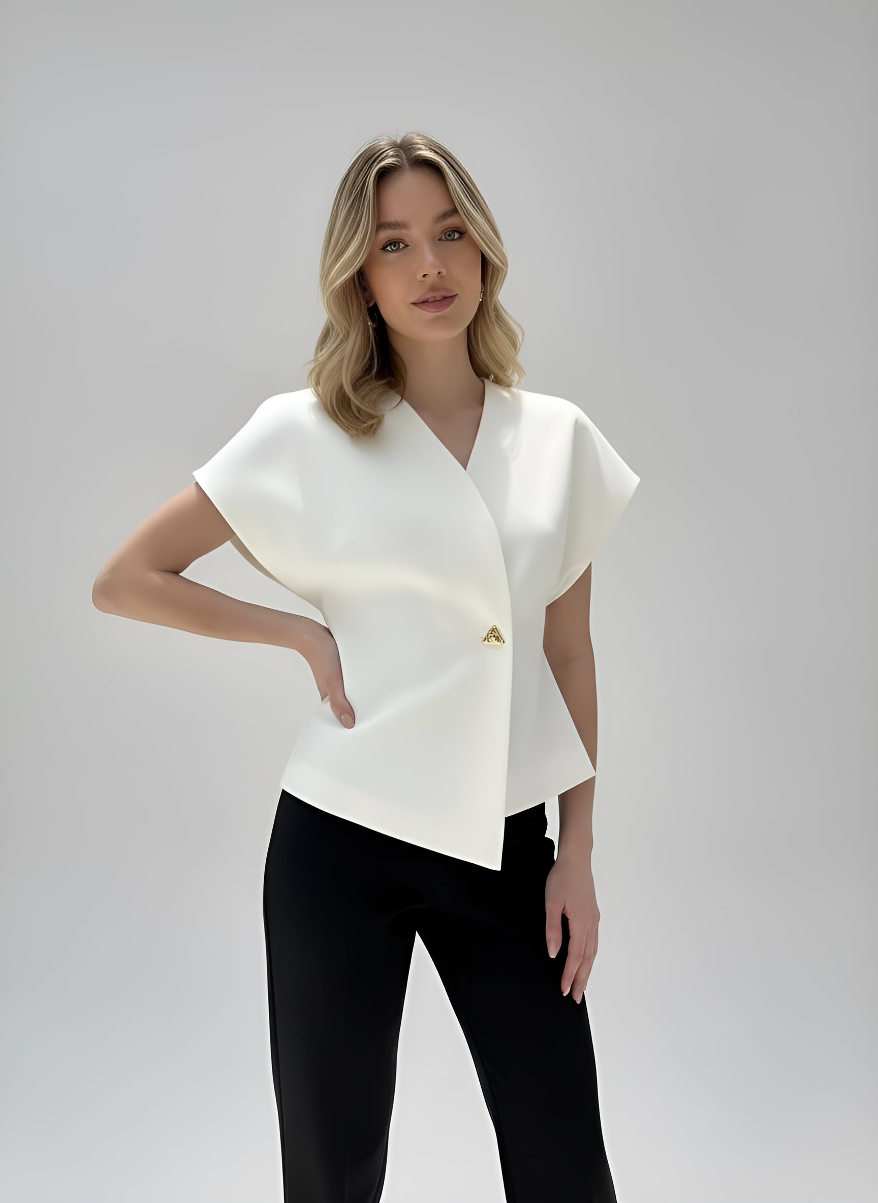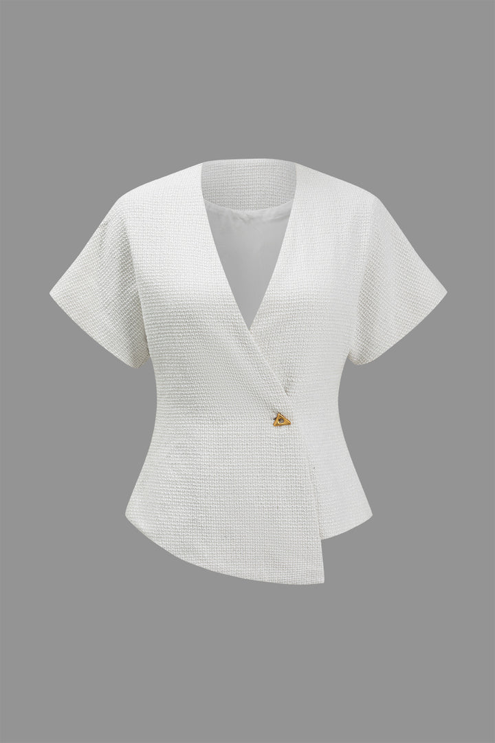 An asymmetrical top with deep V-neckline and short batwing sleeves. Designed with a decorative front button and regular fit.